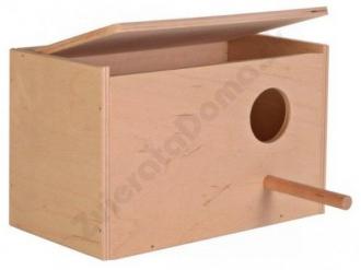 Hniezdiaci drevená búdka s bidielkom. Pri vstupe do búdky je bidielko. Búdka má otvárateľnú striešku pre jednoduché čistenie. Veľkostne vhodná pre andulky.